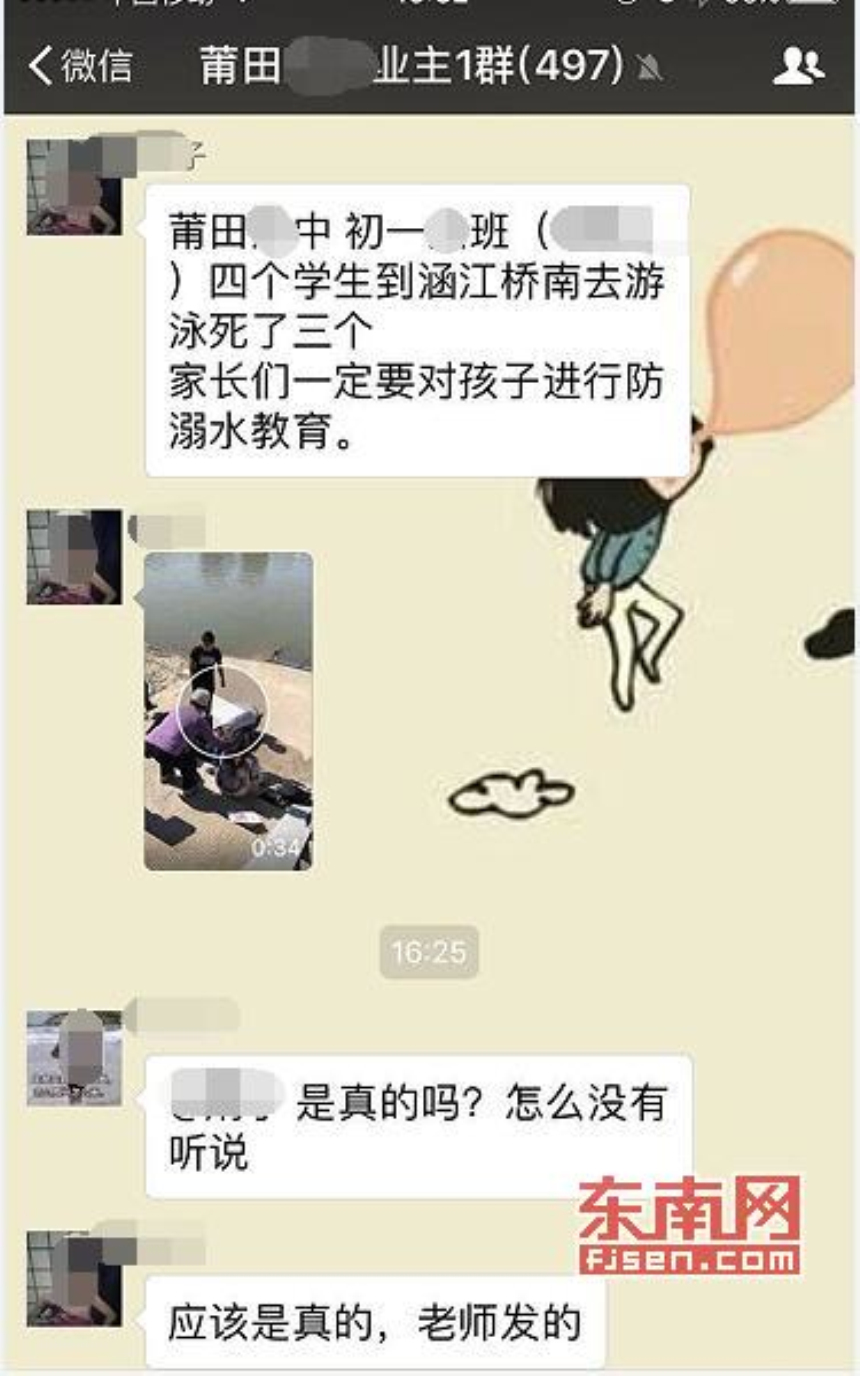東南網(wǎng)莆田5月15日訊(本網(wǎng)記者 李妙珠)今日(5月15日),一段時長34秒的視頻在莆田本地微信群里流傳開,畫面中有家長在河岸邊大聲哭嚎。有網(wǎng)友稱這是“莆田某學(xué)校四學(xué)生,下水游泳死了三個”;也有網(wǎng)友說看到的版本是“莆田某中學(xué)初一六班四個學(xué)生到涵江橋南去游泳死了三個”。東南網(wǎng)記者從莆田市公安局網(wǎng)安支隊了解到,該段視頻內(nèi)容并非發(fā)生在莆田。